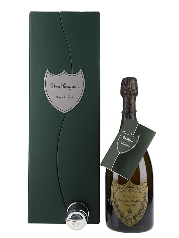 A bottle of Dom Pérignon 1992 vintage Champagne from Moët & Chandon, a blend of 40% Pinot Noir and 60% Chardonnay. This was released in 1999 to coincide with celebrations for the millennium and comes with a silver plated cork keepsake for storing the used Champagne cork made by French homeware brand Christoflé. It is inscribed 31st Decembre 1999.