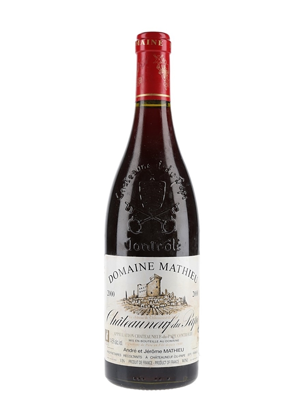 A bottle of 2000 Châteauneuf du Pape from producer Domaine Mathieu in the Southern Rhône's most celebrated appellation.