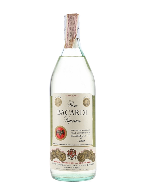 A litre bottle of Bacardi Carta Blanca rum from Spain. We estimate this bottled in the 1960s to 1970s.
