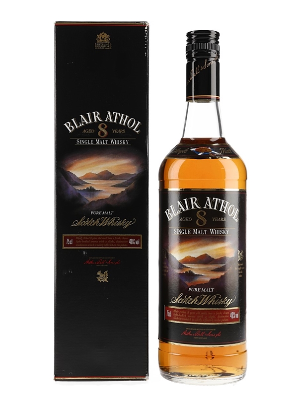 A bottle of Blair Athol 8 Year Old Pure Single Malt Scotch Whisky, distilled and bottled in Scotland by Arthur Bell & Sons Ltd. We estimate this was bottled in the 1980s.