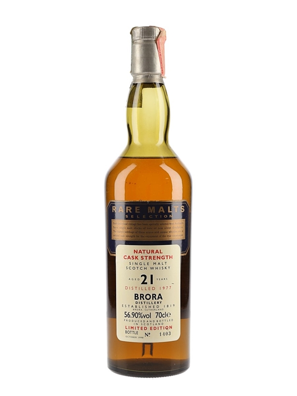 A bottle of Brora 21 Year Old Single Malt Scotch Whisky. This was distilled in 1977 and bottled in October 1998 for Diageo's now discontinued Rare Malts Selection range.