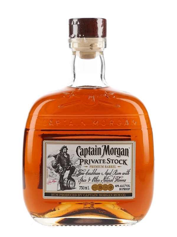 A bottle of Captain Morgan Private Stock Premium Barrel made from a base of Puerto Rican rums blended with spices and natural flavours. This was bottled for the US market.