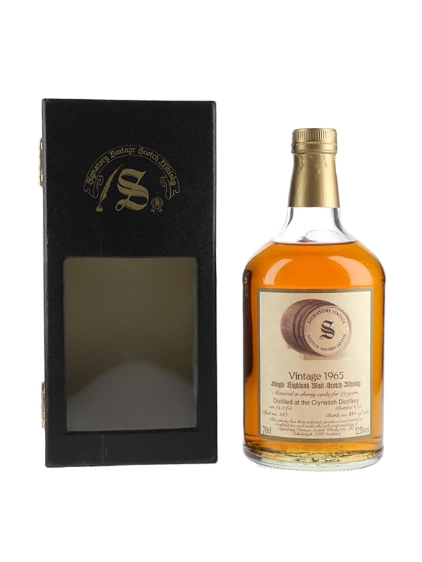 A bottle of Clynelish 1965 29 Year Old Single Highland Malt Scotch Whisky. This was distilled on 19 February 1965 at the distillery now known as Brora, matured in a single sherry butt and bottled in June 1994 by Signatory Vintage.