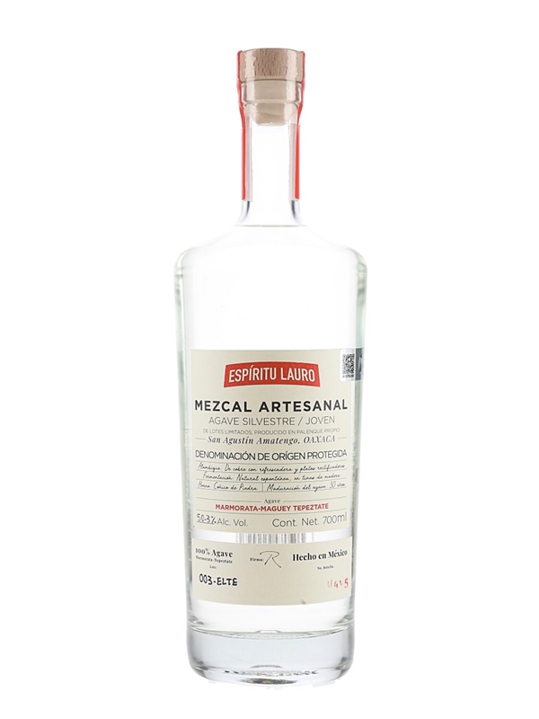 A bottle of Espiritu Lauro Mezcal Joven produced in San Agustin Amatengo, Oxaca and bottled by Espiritu Corsa from using 30 year old Convallis Jabali agave plants. This was imported to the UK by Mexican Booze Ltd., London.