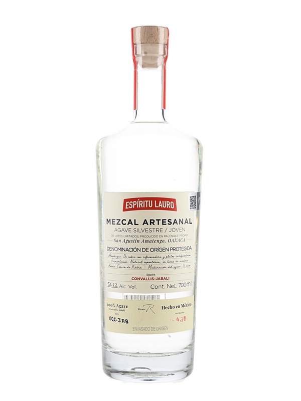 A bottle of Espiritu Lauro Mezcal Joven produced in San Agustin Amatengo, Oxaca and bottled by Espiritu Corsa from using 12 year old Convallis Jabali agave plants. This was imported to the UK by Mexican Booze Ltd., London.