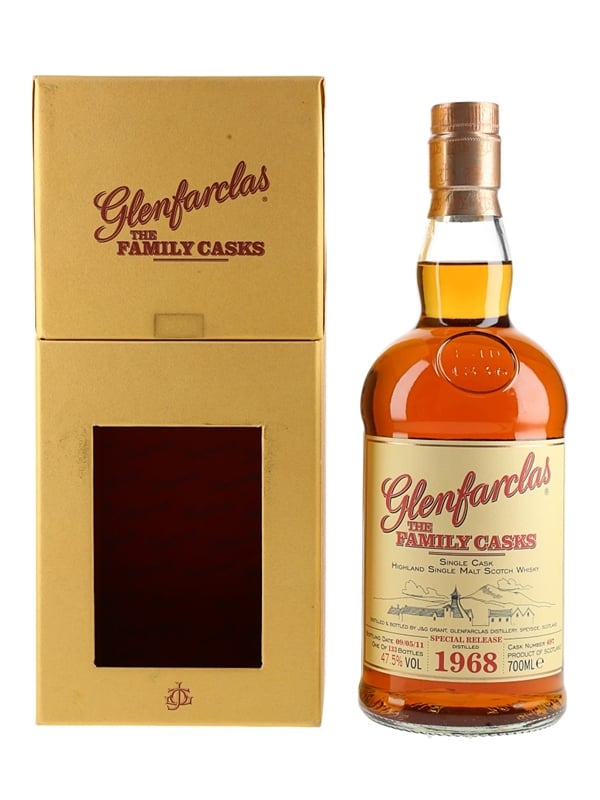 A bottle of Glenfarclas 1968 Single Malt Scotch Whisky. This was distilled in 1968, matured in a sherry butt and bottled at 47.5% ABV on 9 May 2011 as part of The Family Casks series.