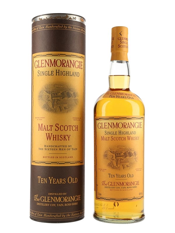 A litre bottle of Glenmorangie 10 Year Old Single Highland Malt Scotch Whisky. The bottling code indicates this was bottled in 2001.