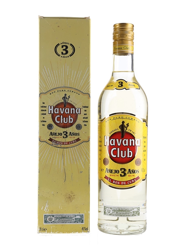 A bottle of Havana Club Añejo 3 Year Old white rum produced in Cuba.
