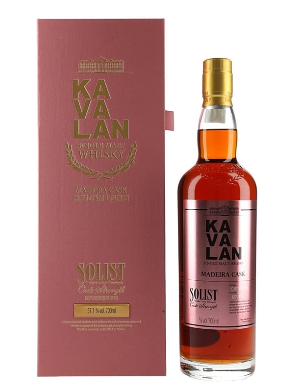 A bottle of Kavalan Solist Single Cask Strength Single Malt Whisky matured in a Madeira Cask and bottled at a cask strength of 57.1%. The bottling code indicates this was bottled on 15 July 2021.