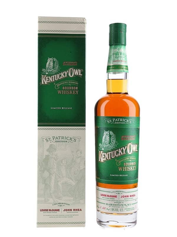 A limited release bottle of Kentucky Owl St Patrick's Edition Kentucky Straight Bourbon Whiskey, a collaboration between Louise McGuane, Irish Whiskey Bonder, and John Rhea, Master Blender, to celebrate the long standing connection between American and Irish Whiskey Makers.