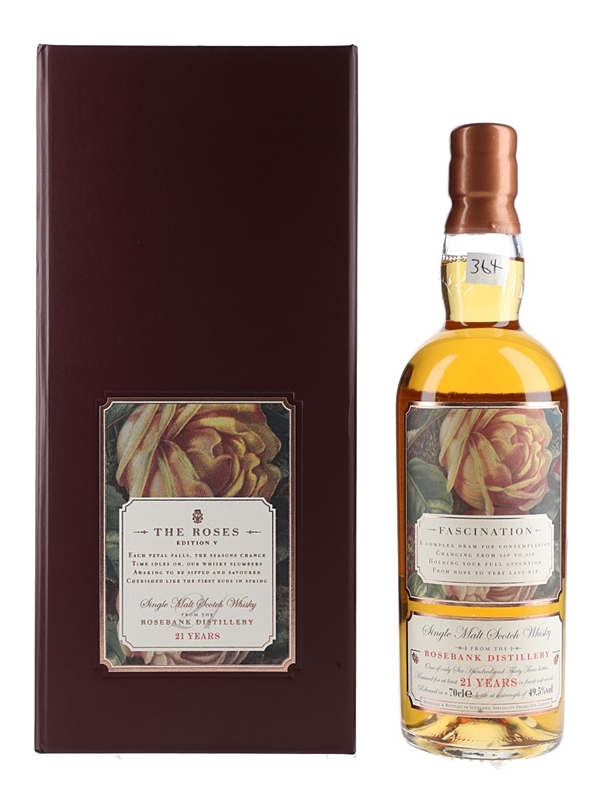 A bottle of Rosebank 21 Year Old Single Malt Scotch Whisky, bottled by Speciality Drinks Ltd. This release, Fascination, is the fifth edition in the Rosebank Roses series.
