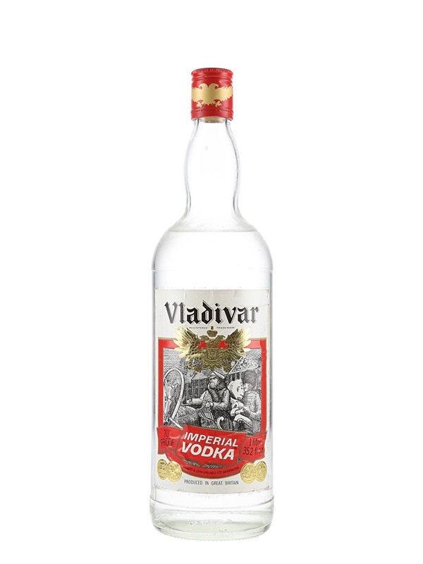 A litre bottle of Vladivar Imperial Vodka, produced by Gilbert & John Greenall Ltd. in Warrington, Great Britain. We estimate this was bottled in the 1970s.