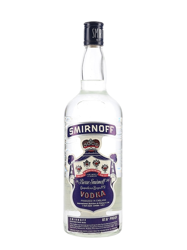 A litre bottle of Smirnoff Blue Label Vodka, produced in England by International Distillers & Vintners Ltd. for Duty Free stores. We estimate this was bottled in the 1970s.