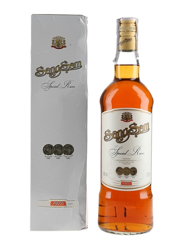 A bottle of SangSom Special Rum distilled, aged, blended and bottled in Thailand by Sang Som Co. Ltd.