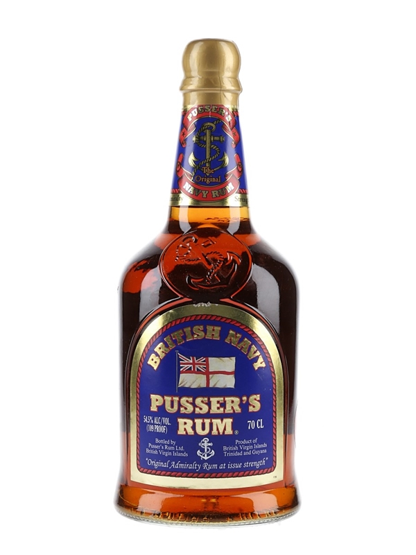 A bottle of Pusser's British Navy Rum, produce of Guyana, Trinidad, and the British Virgin Islands. This was imported to the UK by Cellar Trends.
