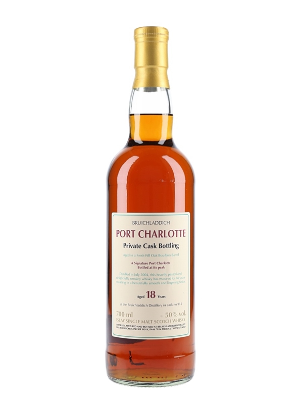 A private cask bottling of Port Charlotte 18 Year Old Islay Single Malt Scotch Whisky, distilled in 2004 and matured in a single Bourbon Barrel before being bottled at 50% ABV.