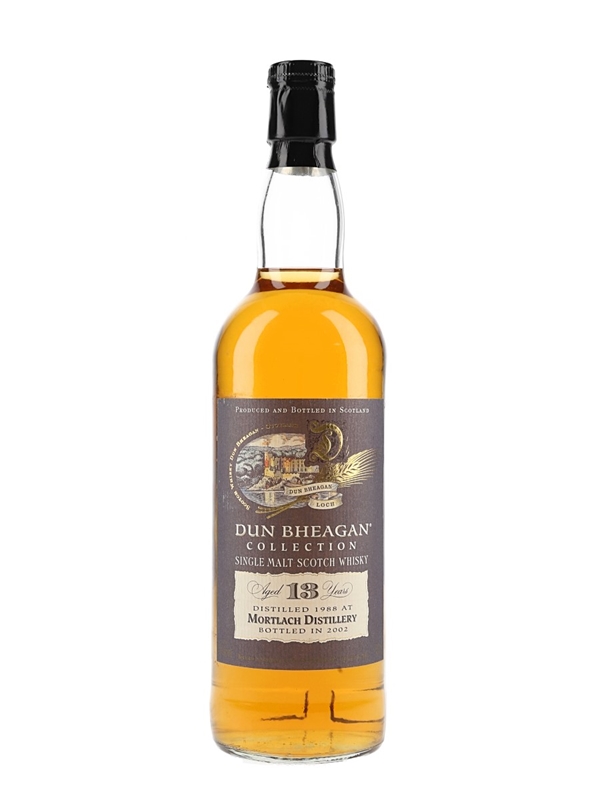A bottle of Mortlach 13 Year Old Single Malt Scotch Whisky. This was distilled in 1988 and bottled in 2002 by William Maxwell & Co. Ltd. for the Dun Bheagan series of vintage bottlings.