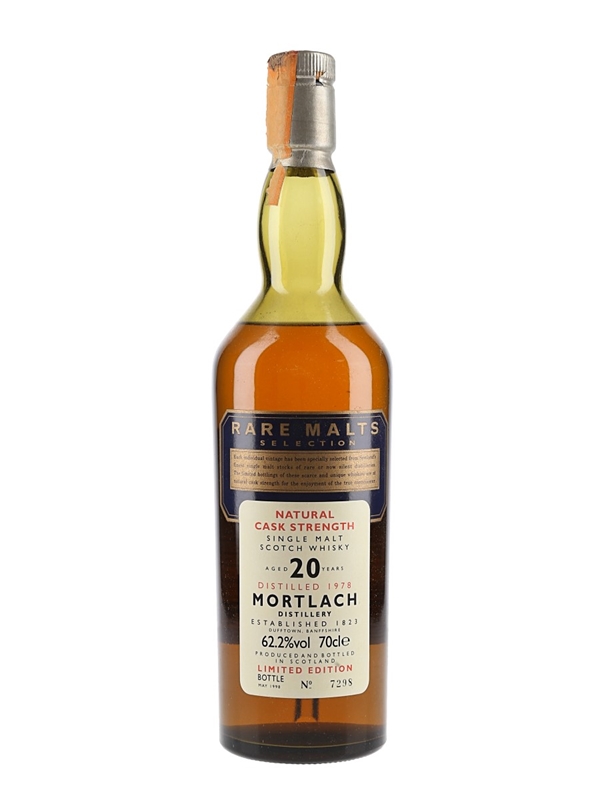 A bottle of Mortlach 20 Year Old Natural Cask Strength Single Malt Scotch Whisky. This was distilled in 1978 and bottled for Diageo's now-discontinued Rare Malts Selection in May 1998.
