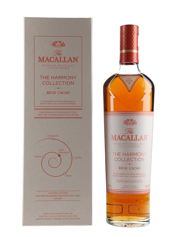 A bottle of The Macallan Rich Cacao Highland Single Malt Scotch Whisky from The Harmony Collection. This is inspired by the chocolate creations of Spanish chef Jordi Roca, pastry chef at El Celler de Can Roca. The restaurant was twice voted best restaurant in the world.