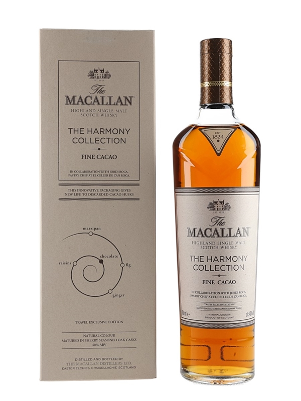 A bottle of The Macallan Fine Cacao Highland Single Malt Scotch Whisky from The Harmony Collection. This is inspired by the chocolate creations of Spanish chef Jordi Roca, pastry chef at El Celler de Can Roca. The restaurant was twice voted best restaurant in the world.