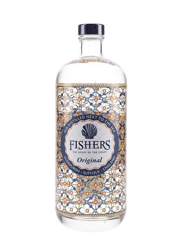 A bottle of Fishers London Dry Gin, made with rare and old English botanicals and distilled in small batches.