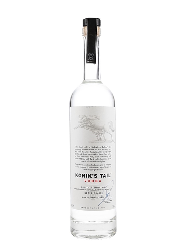 A bottle of Konik's Tail, a Polish vodka made from golden rye, early winter wheat, and spelt grain.