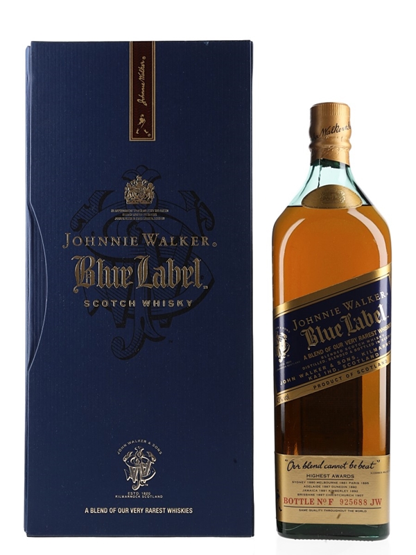 A old presentation litre bottle of Johnnie Walker's prestige blend, Blue Label, in a presentation box.