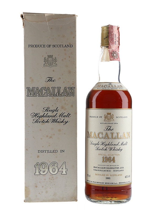 A bottle of The Macallan Single Highland Malt Scotch Whisky. This was distilled in 1964, matured in sherry casks and bottled in 1981 at 43% ABV. This was imported to the Italian market by Rinaldi.