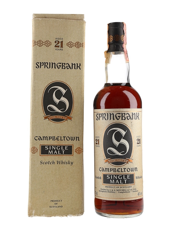 A bottle of Springbank 21 Year Old Campbeltown Single Malt Scotch Whisky. We estimate this was bottled in the 1990s.