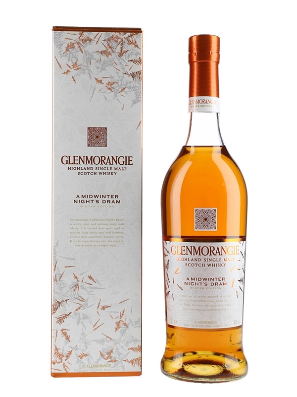 A bottle of Glenmorangie A Midwinter Night's Dram Highland Single Malt Scotch Whisky, a limited edition bottling that was aged in bourbon, oloroso and Pedro Ximenez sherry casks.