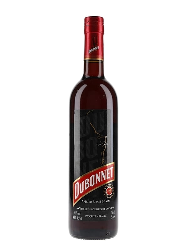 A bottle of Dubonnet Wine Aperitif, a fortified wine flavoured with herbs, spices, and quinine.