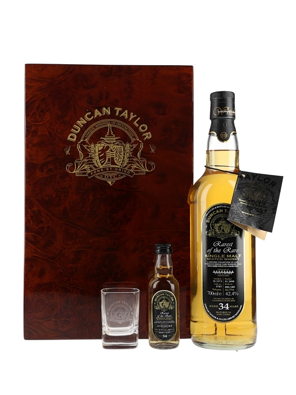 A bottle of Ayrshire 34 Year Old single malt Scotch whisky. This was distilled at Ladyburn Distillery in October 1973, matured for 34 years and bottled by Duncan Taylor in January 2008.