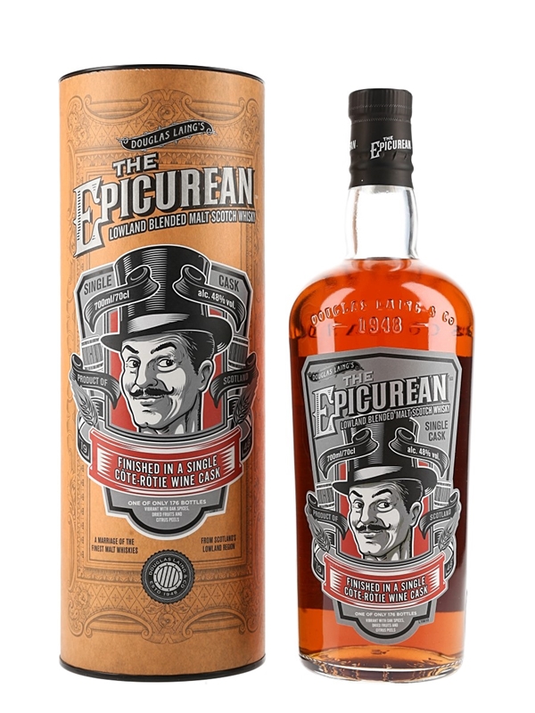 A bottle of The Epicurean Lowland Blended Malt Scotch Whisky. This is a blend of malt whiskies from the Lowland, finished in a single red wine cask from the Côte-Rôtie region in the Northern Rhône valley of France. This is the first edition in the Epicurean Wood Finish series from independent bottler Douglas Laing.