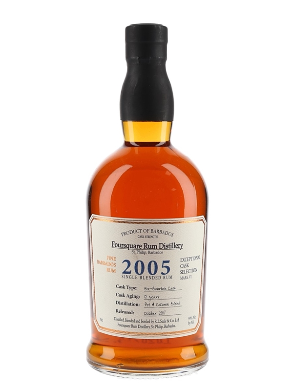 A bottle of Foursquare 2005 Cask Strength Single Blended Rum from Barbados. This is a blend of artisanal pot distillation and traditional twin column continuous distillation, matured in ex-bourbon casks for 12 years and released in October 2017 at a cask strength of 59% ABV as part of the Exceptional Cask Selection series.