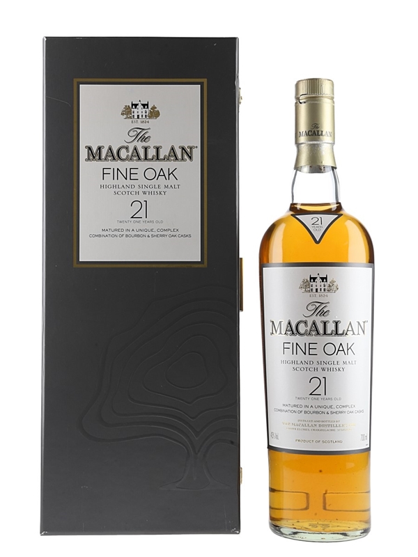 A bottle of Macallan 21 Year Old Fine Oak. This was matured in a mixture of bourbon and sherry casks.