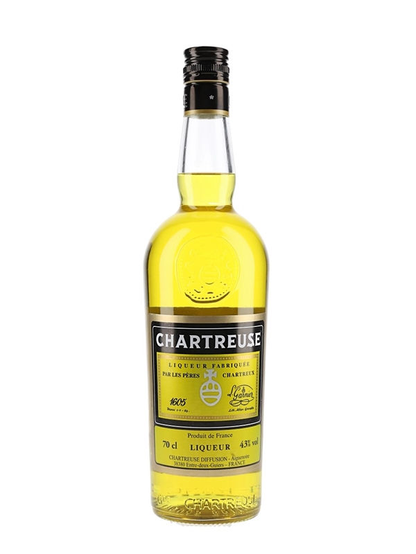 A bottle of yellow Chartreuse liqueur, produced in France.