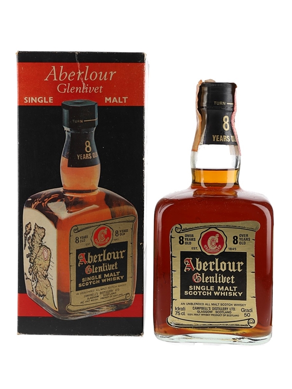 A bottle of Aberlour-Glenlivet 8 Year Old Unblended All Malt Scotch Whisky, bottled at 50% ABV. This was bottled for the Italian market and imported by Rinaldi, we estimate in the 1960s.