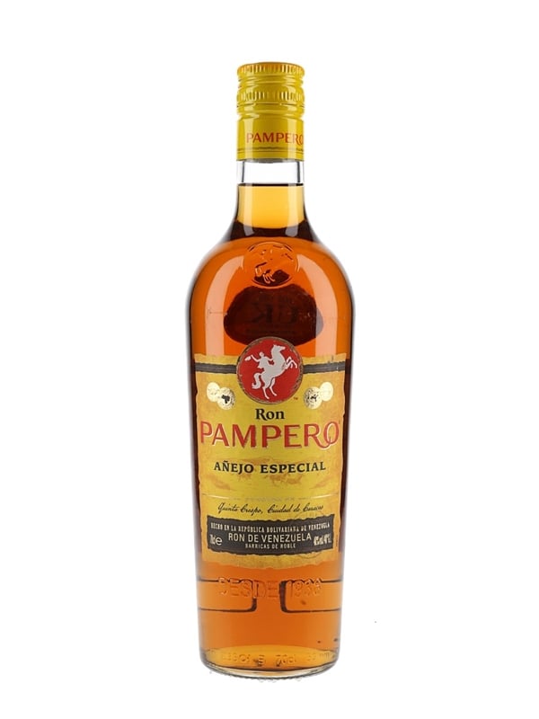A bottle of Ron Pampero Añejo Especial, produced in Venezuela and bottled in Italy by DOI.