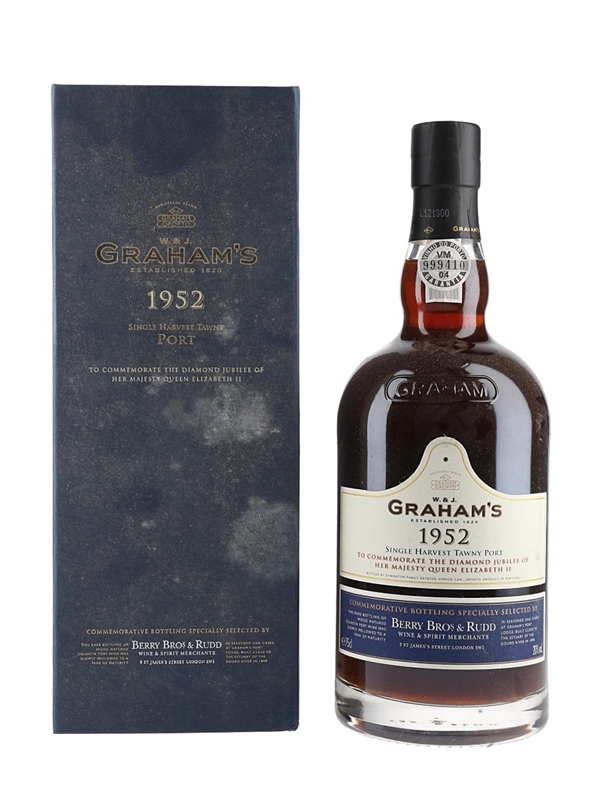 A bottle of 1952 Graham's Single Harvest Tawny Port, matured for six decades, and bottled as a commemorative bottling for Berry Bros. & Rudd to celebrate the Diamond Jubilee of Queen Elizabeth II in 2012.
