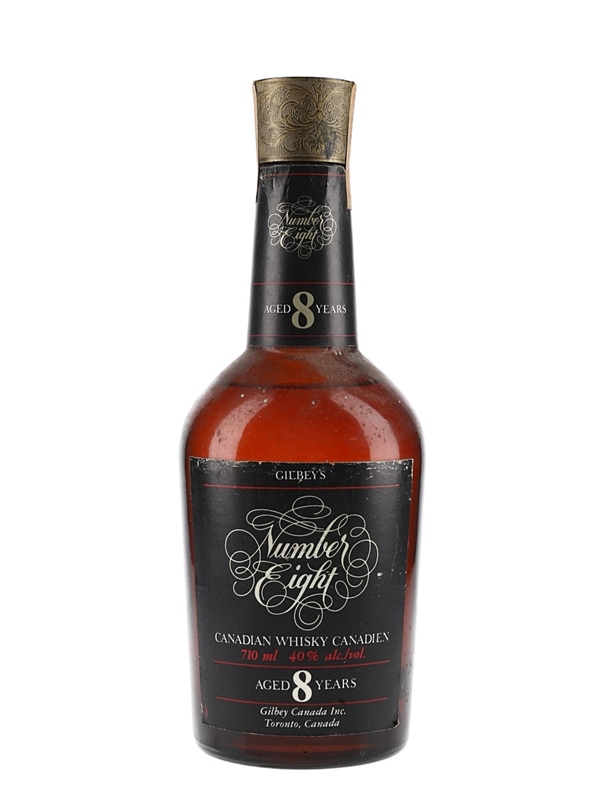 A bottle of Gilbey's Number Eight 8 Year Old Canadian Whisky. The tax stamp is dated 1974.