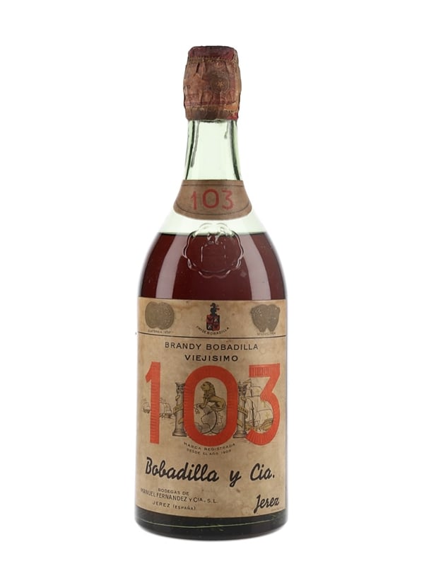 A 73cl bottle of Bobadilla 103 Brandy de Jerez from Spain. This was imported to the Italian market by Gaudi Gilberto, we estimate in the 1960s to 1970s.