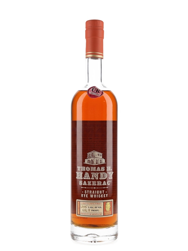 A bottle of Thomas H Handy Sazerac straight rye whiskey, bottled at 63.45% ABV by Buffalo Trace Distillery in 2010 as part of the Buffalo Trace Antique Collection.
