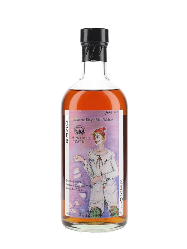 A bottle of Ichiro's Malt The Joker Japanese Single Malt Whisky from the Card series bottled at a cask strength of 57.7% ABV. This was imported to the UK by Number One Drinks Company Ltd.
