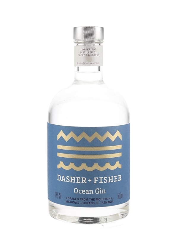 A bottle of Dasher & Fisher Ocean Wild Gin, produced in Tasmania by Southern Wild Distillery. This gin is named after two Tasmanian rivers and uses 12 locally foraged botanicals.