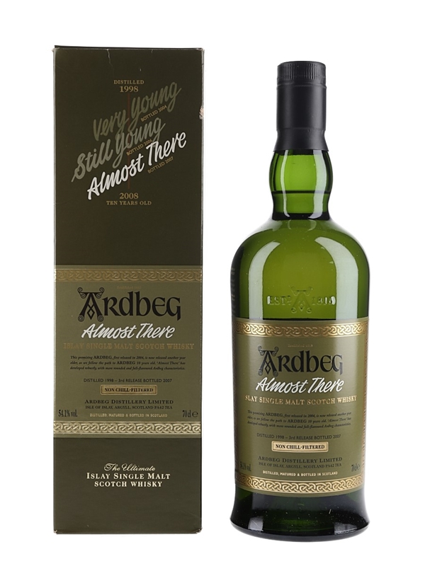 A bottle of Ardbeg Almost There Islay Single Malt Scotch Whisky, distilled in 1998 and bottled in 2007. This was the third release in Ardbeg's journey to a new 10 year old after its purchase by Glenmorangie in 1997.