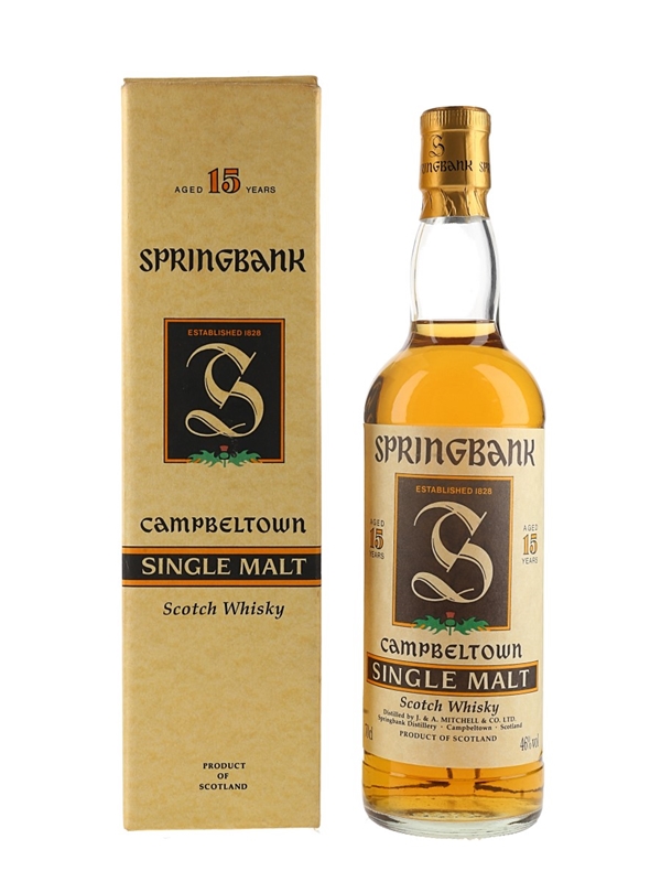 A bottle of Springbank 15 Year Old Campbeltown Single Malt Scotch Whisky with the 'Green Thistle' on the label. We estimate this was bottled in the 1990s.