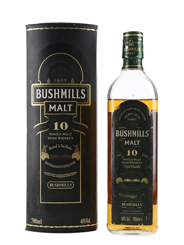 A bottle of Bushmills 10 Year Old Irish Single Malt Whiskey. This was matured in bourbon and oloroso sherry casks.