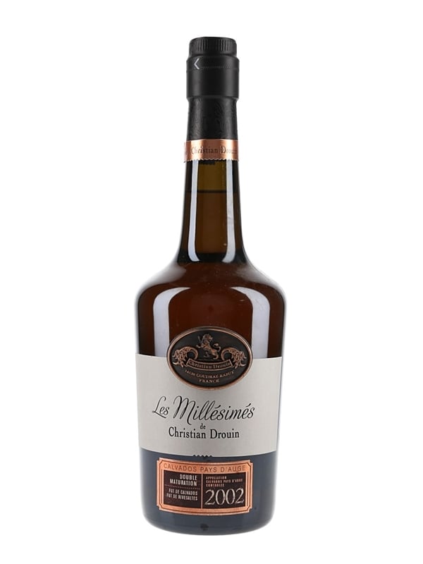 A bottle of Calvados Pays d'Auge 2002 double matured in a copper pot still and aged in oak barrels of Calvados and old barrels of Rivesaltes.