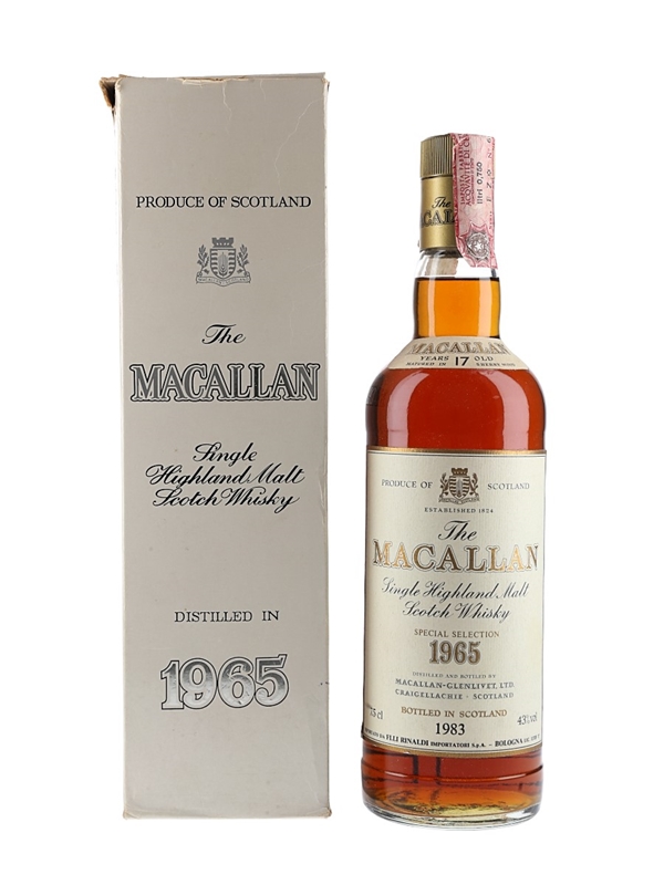 A bottle of The Macallan 17 Year Old Single Highland Malt Scotch Whisky matured in sherry casks. This was distilled in 1965 and bottled in 1983 for the Italian importer Rinaldi.