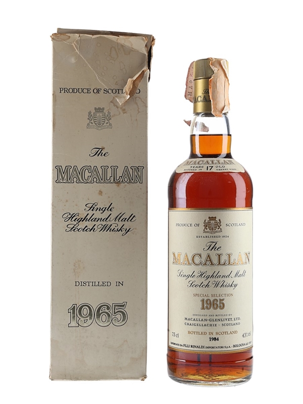 A bottle of The Macallan 17 Year Old Single Highland Malt Scotch Whisky matured in sherry casks. This was distilled in 1965 and bottled in 1983. This was imported to Italy by Rinaldi.